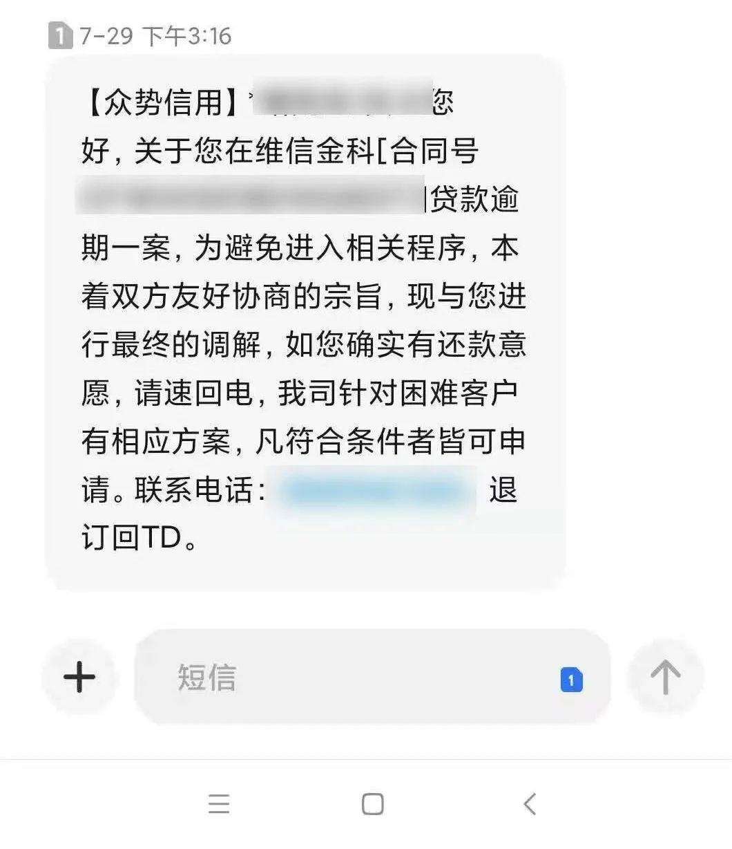 张某再次收到催款短信,称7月30日是最后还款日,逾期不还将会影响其个人征信